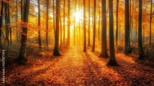 Obraz premium Enchanting Autumn Woodland: A Serene Walk Through Sunlit Trees with Golden...