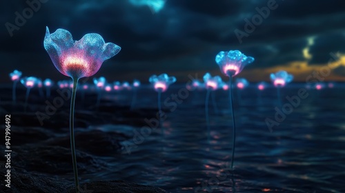 Fototapeta premium Enchanting Bioluminescent Flowers Illuminating a Dark Ocean Landscape at Dusk