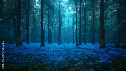 © Thawatchai, Naklejka premium Enchanting Bioluminescent Forest Clearing with Lush Moss Carpet and Towering Glowing Trees
