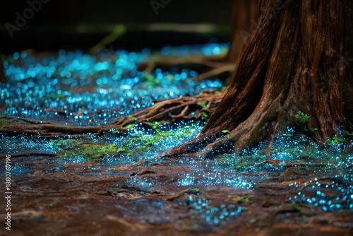 © Iryna, Obraz premium Enchanting bioluminescent forest floor at night