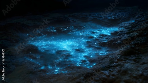 Naklejka premium Enchanting blue bioluminescence sparkles on a dark textured ocean surface at...