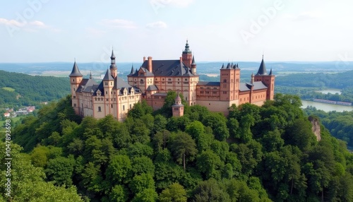 Fototapeta premium Enchanting castle on a verdant hill a testament to timeless grandeur