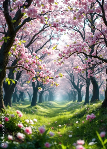 Naklejka premium Enchanting cherry blossom pathway in spring forest
