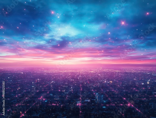 © pitchanat, Fototapeta premium Enchanting Cityscape at Twilight with a Mesmerizing Pink Sky and Twinkling Stars Creating a Dreamy Urban Atmosphere Full of Wonder and Beauty
