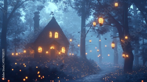 Fototapeta premium Enchanting cottage nestled in a misty, moonlit forest, illuminated by glowing lanterns.