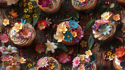 © Chanakan, Fototapeta premium Enchanting Cupcakes Seamless Pattern with JewelToned Mirror Glaze and HandPiped Floral Garlands