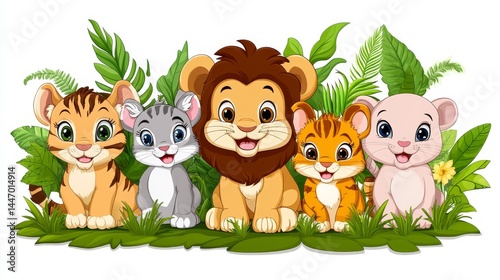 © Artajar, Naklejka premium Enchanting depiction of five endearing baby wild animals nestled among verdant foliage capturing the essence of playful charm and wildlife allure
