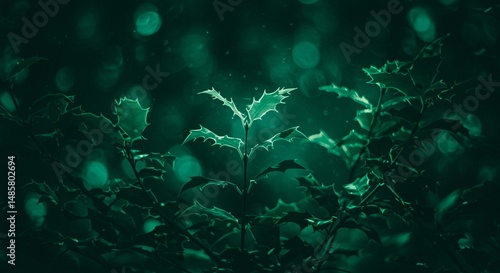 Fototapeta premium Enchanting Emerald Holly Leaves in a Dark Forest Setting. A mystical nature scene with bokeh lights
