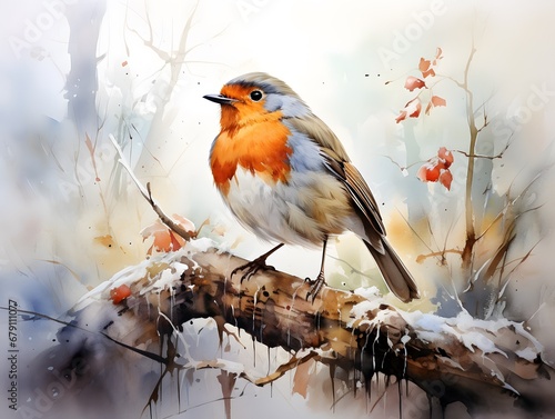 Fototapeta premium Enchanting European Robin: Captivating Woodland Creature in Watercolor