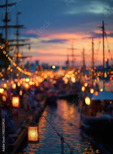 © satisfied, Fototapeta premium Enchanting Evening at the Harbor - Lanterns and Ships at Dusk.