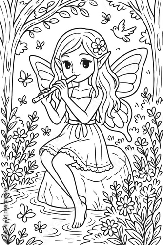 © Rizhan Alkhairan, Fototapeta premium Enchanting fairy with flute sitting by stream in forest coloring page art