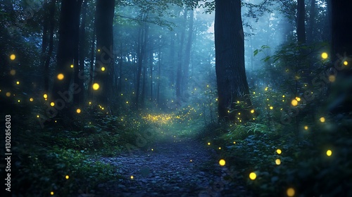 Obraz premium Enchanting fireflies dance in lush greenery organic forest pathway natural...
