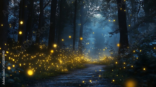 Fototapeta premium Enchanting fireflies illuminating a lush greenery pathway in nature's organic...