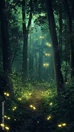 © PANGERANDESIGN, Obraz premium Enchanting firefly path in a mystical forest.