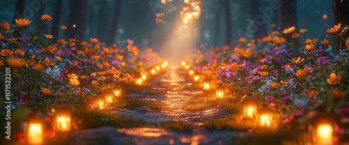 © budiyono, Naklejka premium Enchanting flower path in a mystical forest lit by glowing lanterns.