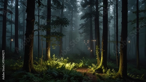 © ikk.gtg, Obraz premium Enchanting foggy forest path illuminated by glowing orbs at night.