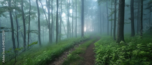 Naklejka premium Enchanting Foggy Forest Path: Tranquil Trail Amidst Misty Trees and Sunlit...