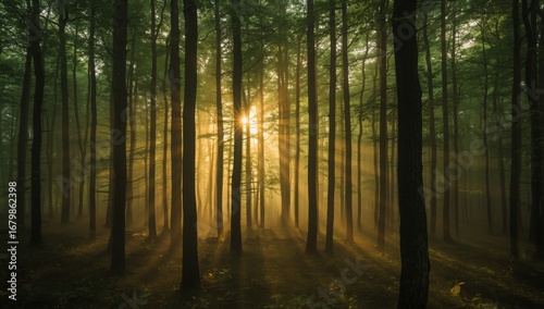 Obraz premium Enchanting forest bathed in golden sunrise light with ethereal sunbeams...