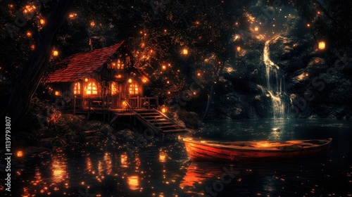 Obraz premium Enchanting forest cabin by lake with lights and boat.
