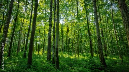 Naklejka premium Enchanting Forest Canopy: Tranquil Woodland Scene for Environmental Themes