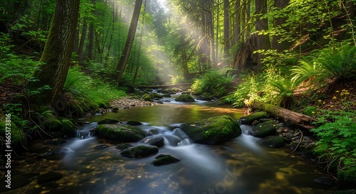 Obraz premium Enchanting Forest Creek with Morning Sun Rays Through Trees.