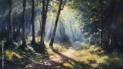 © Aku, Naklejka premium Enchanting Forest Glade, A Serene Path Bathed in Golden Sunlight and Shadows