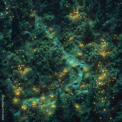 Fototapeta premium Enchanting forest illuminated by glowing fireflies at night, creating a...