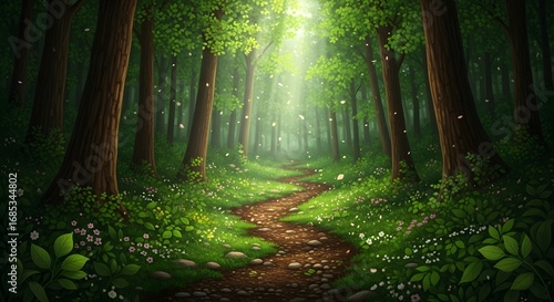 Obraz premium Enchanting forest path bathed in ethereal sunlight, with lush green foliage and a gentle scattering of magical dust motes creating a serene and inviting atmosphere