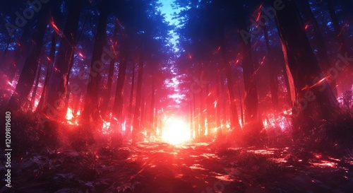 © boler, Naklejka premium Enchanting Forest Path Illuminated by Ethereal Red and Blue Light