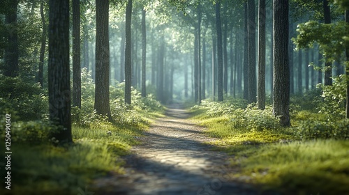 Fototapeta premium Enchanting forest path illuminated by soft rays of sunlight filtering through the trees