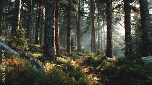 Obraz premium Enchanting Forest Path: Sunlight Streaming Through Towering Trees Landscape