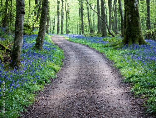 © Balaraw, Fototapeta premium Enchanting forest path through a sea of bluebells