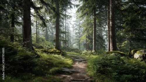 Obraz premium Enchanting Forest Path Through Verdant Woodland, Nature Scene with Lush Greenery and Atmospheric Lighting