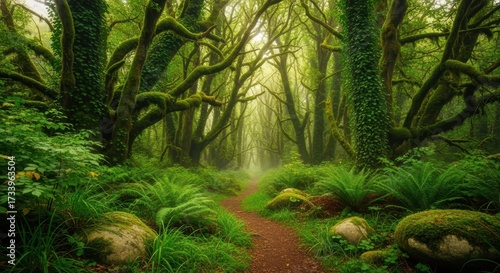Naklejka premium Enchanting forest path winds through ancient moss-covered trees creating a mystical green tunnel. Lush ferns carpet the floor while twisted branches form natural arches overhead.