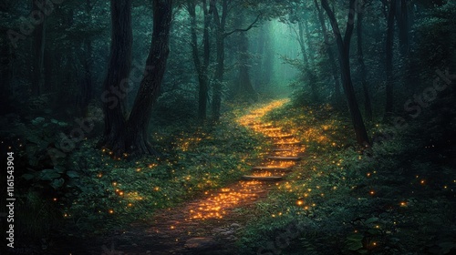 © hazia, Obraz premium Enchanting forest path with fireflies illuminating stone steps.