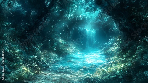 © Woranuch, Fototapeta premium Enchanting Forest Path with Glowing Waterfall and Stream.