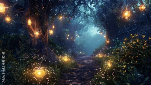 © CRISPIFLY, Obraz premium Enchanting Forest Path with Lanterns at Night