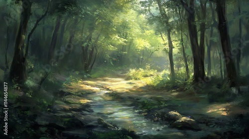 © Siriroj, Obraz premium Enchanting Forest Path with Serene Flowing Stream and Lush Foliage