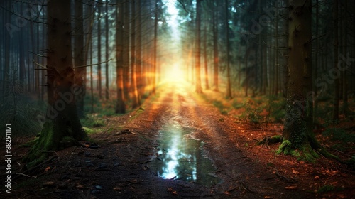 Obraz premium Enchanting Forest Path with Sunlight Breaking Through Trees and Reflective Puddle