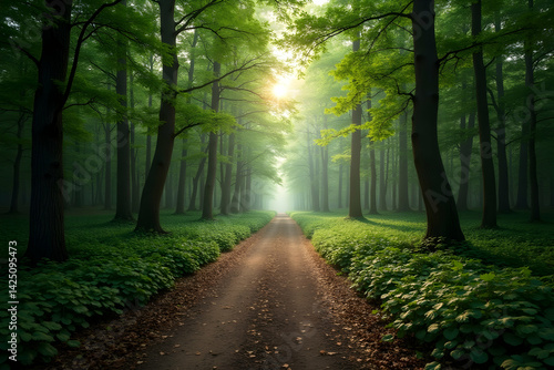 Fototapeta premium Enchanting forest path with sunlit foliage and a serene atmosphere, creating...