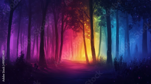 Obraz premium Enchanting Forest Path with Vibrant Rainbow Colors and Mystical Atmosphere at...