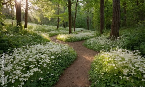 © Valfiyy, Fototapeta premium Enchanting forest path with wildflowers and sunbeams creating a peaceful natural scene