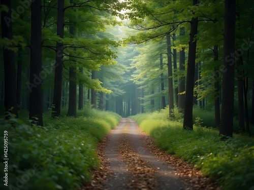Obraz premium Enchanting Forest Pathway, A Serene Journey Through Sunlight and Shadow,...