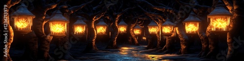Naklejka premium Enchanting Forest Pathway Illuminated by Warm Glowing Lanterns, Surrounded by...