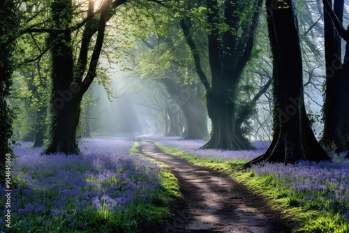 Fototapeta premium Enchanting forest pathway lined with bluebells under a lush green canopy