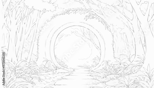 Fototapeta premium Enchanting forest pathway sketch with a mystical circular archway and lush greenery