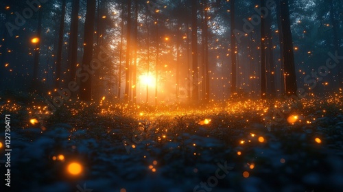 Naklejka premium Enchanting Forest Scene at Sunset with Magical Glow of Fireflies Illuminating the Trees and Ground in Serene Atmosphere