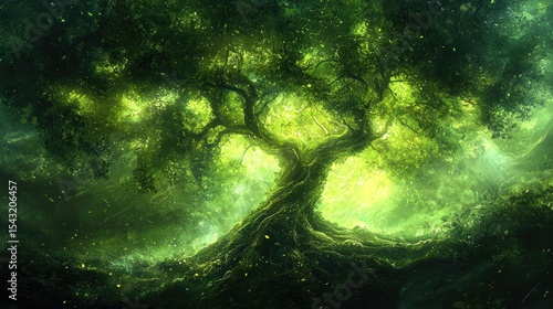 © Jolodong, Obraz premium Enchanting forest scene with a colossal tree.
