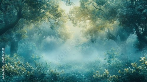 Fototapeta premium Enchanting forest scene with mist and soft sunlight filtering through trees