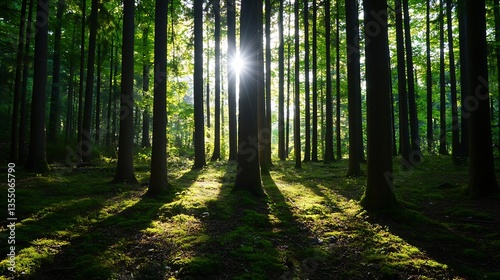 Obraz premium Enchanting Forest Scene with Sunlight Streaming Through Tall Trees Creating...